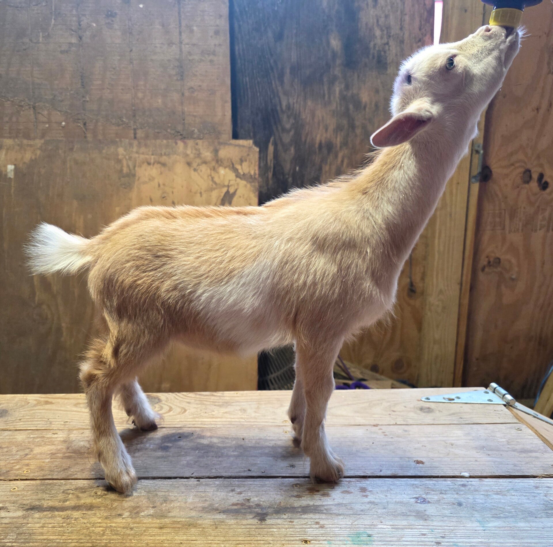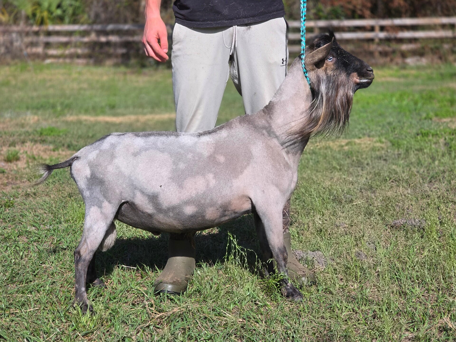 He is turning out to be a nice little buck. Fresh off his first ever shave and his complete refusal to set up. At just a year old, we will keep working on it! Comes from great lines on his sire's side, with his granddam scoring an EEEE91!!!!